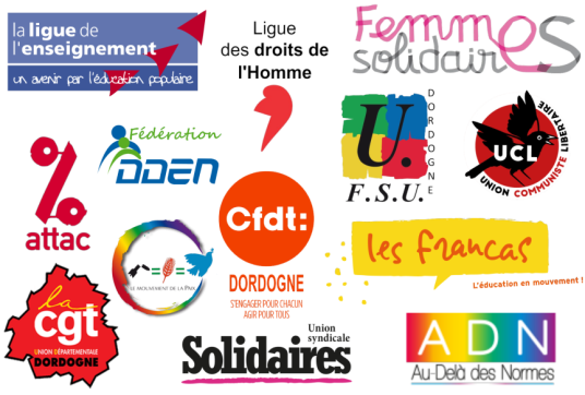 Le 8 juin 2024 14 organisations associatives et syndicales de Dordogne (dont la Ligue de l'enseignement) ont décidé d'unir leurs forces en créant ce collectif qui lance un appel au rassemblement ce samedi 15 juin à 10h30 devant le palais de Justice de Périgueux